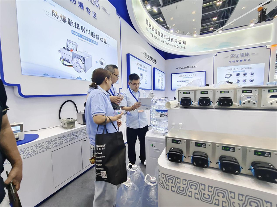保定思諾流體科技有限公司的展位前人頭攢動,特別是其展示的AI智能蠕動泵能接入AI智能語音系統(tǒng),實現(xiàn)萬物智聯(lián),智能體驗讓AI解放雙手,還能實現(xiàn)全數(shù)據(jù)本地與云存儲,讓復雜控制的應用變得簡單易操作。新研發(fā)的具有高防爆和高防護等級的防爆觸摸屏伺服蠕動泵,0轉起步,高精度控制,擁有專業(yè)防爆觸摸屏,采用伺服防爆電機,體形小巧,動力強勁,震動小,噪音低,精簡的界面讓操作更便捷。同時還有調速模式、定速定量兩種控制模式可以自由切換。