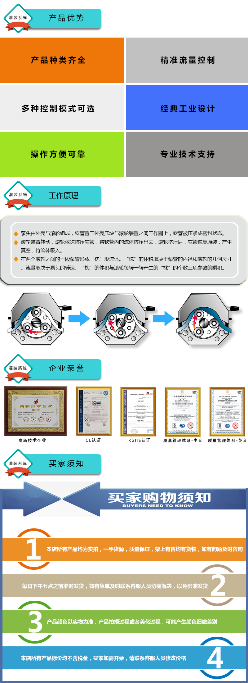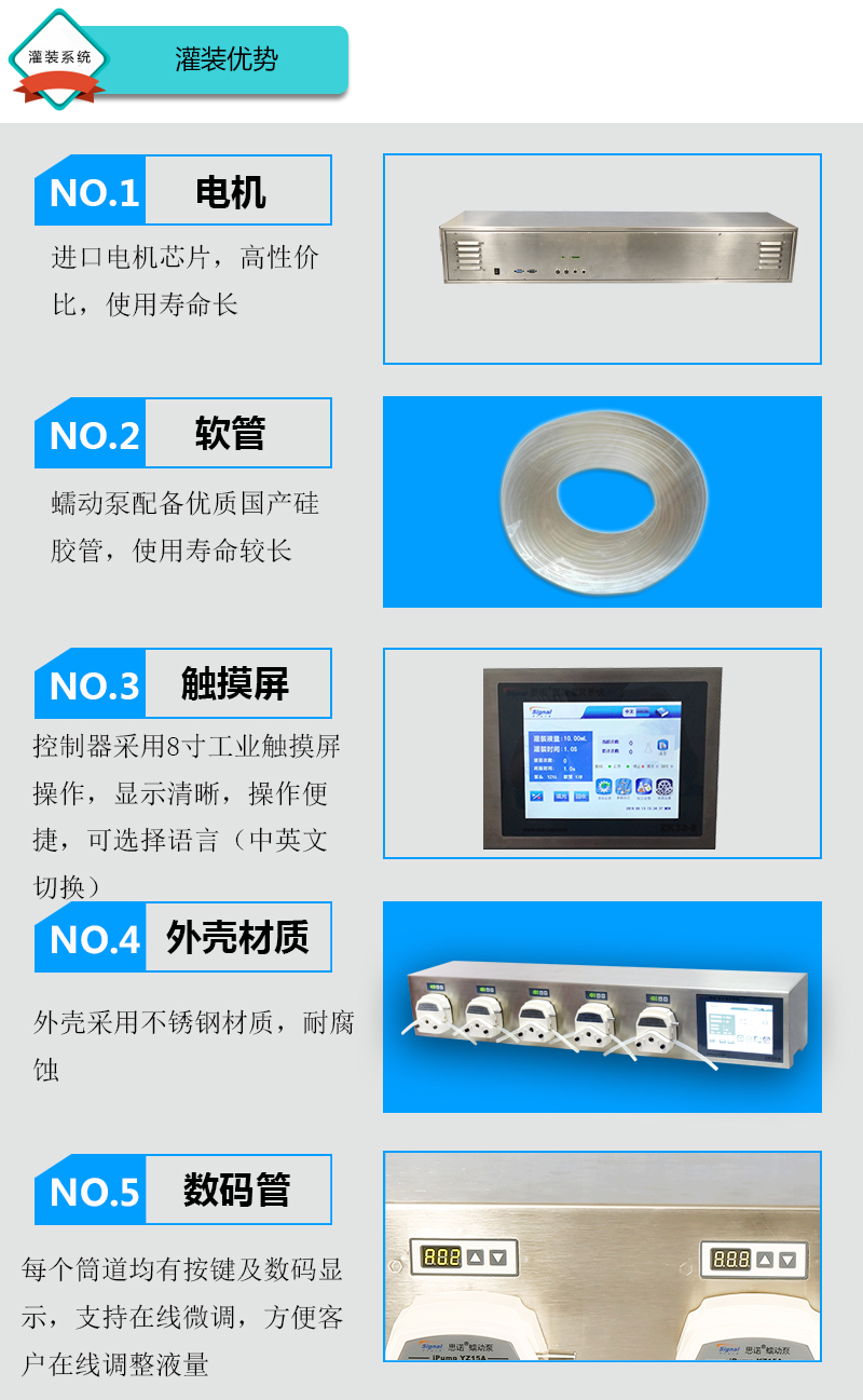 1.灌裝系統由5組基本通道(可擴展至32通道),一臺控制器組成,可安裝YZ15、YZ25泵頭