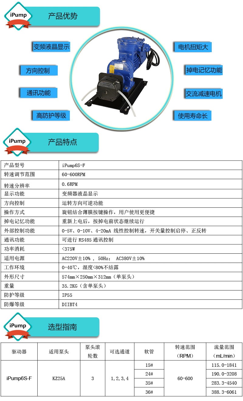 ? ? ?1.流量范圍:115.0-6061mL/min ? ? ?2.免維護交流防爆減速電機驅動,變頻器調節轉速 ? ? ?3.電機扭矩大,可級聯雙泵頭 ? ? ?4.防爆等級DIIBT4,適合易燃易爆環境使用