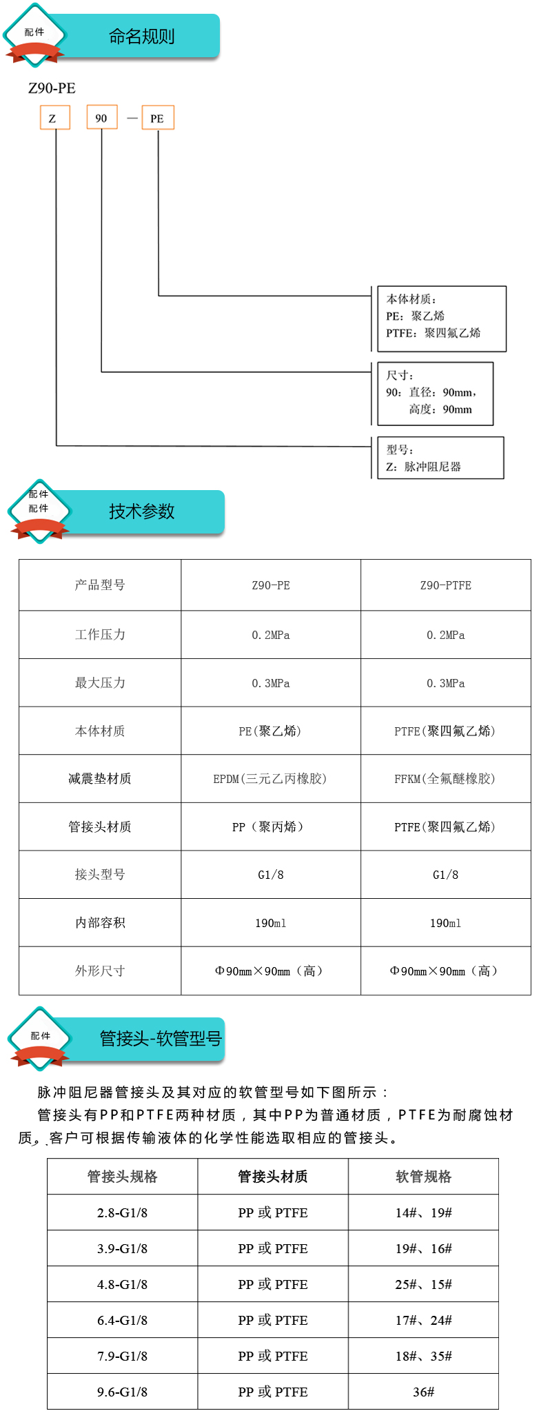 Z90-PE(聚乙烯)和Z90-PTFE(聚四氟乙烯)兩種型號,客戶可根據(jù)傳輸液體的化學(xué)性能選取相應(yīng)型號的脈沖