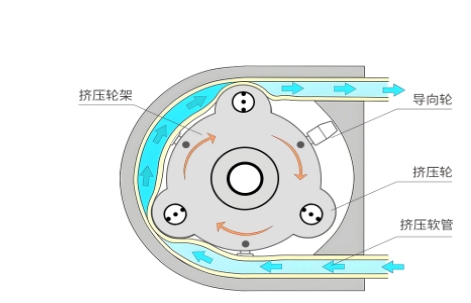 “擠壓-回彈”的循環(huán):電機帶動轉(zhuǎn)子旋轉(zhuǎn),輥輪依次碾壓軟管,形成局部封閉的液腔