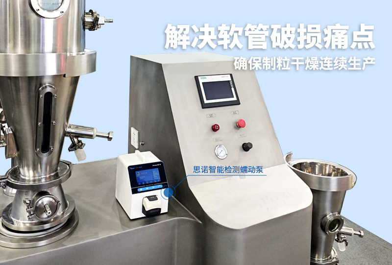 針對這一痛點(diǎn),該企業(yè)為其制粒干燥機(jī)配套選用了iPump2ZS-B+FT15智能檢測蠕動泵。這款設(shè)備配備的漏液報警系統(tǒng)解決了難題。