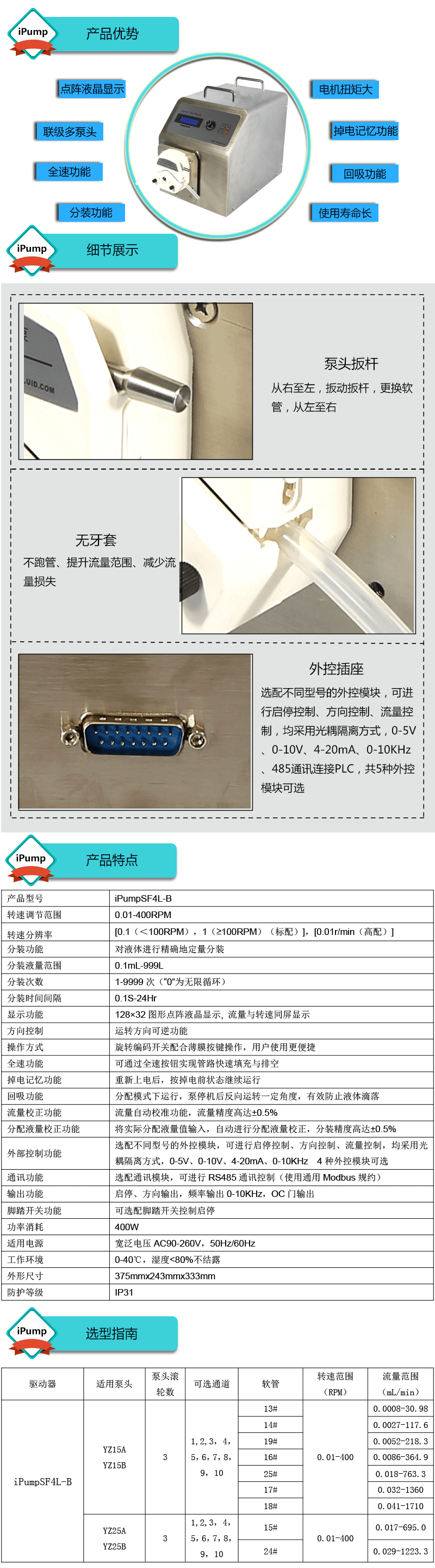 1.流量范圍:0.0008-1710mL/min 2.兩種工作模式,流量模式與分配模式可選 3.具有流量校正、分裝液量校正功能 4.分裝精度高達±0.4%以內 5.采用伺服電機驅動,控制準,動力強勁 6.線路板全部三防漆處理,防腐、防潮